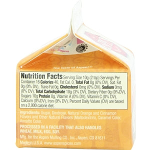Ingredients: Sugar, Dextrose, Natural Orange & Cinnamon Flavors & Other Natural Flavors (Maltodextrin), Caramel Color, Annatto Color.