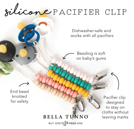 Never lose a pacifier again and look good while doing it. Our silicone pacifier clips are easy to mix and match with any outfit and the silicone beads create a clean, modern look. They work with any pacifier and keep them close, clean and most importantly, off the floor. Designed with a stainless steel clip that makes the entire product dishwasher safe, you can really clean these little darlings. In over 15 color options, our paci clips are what all the babies are wearing this season!
