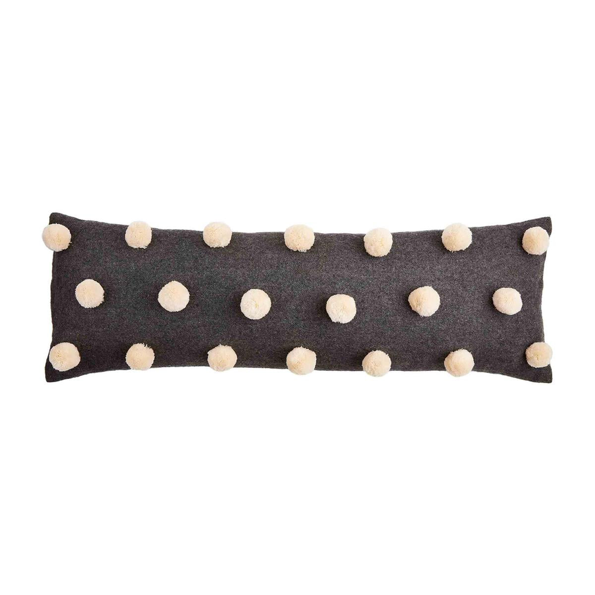 Our Square or Lumbar Black Pom-Pom Pillows features an eye catching design. The felt pillow features yarn pom-poms. The background of the pillow is a dark gray coloring while the pillow has black pom poms throughout. This pillow is made of wool, polyester and nylon. The pillow should be spot cleaned only.