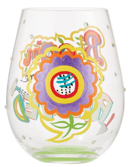 This stemless wine glass by Lolita encourages us to bloom where we're planted. We can't always control where we're at in life, but we can always make the most of where we are. This colorful glass features chromatic script and a bright flower design.