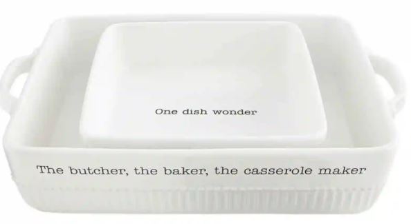 Don?t be a one dish wonder with our Casserole Baker Dish Set. The nested set comes with two fluted ceramic baking dishes. The dishes each feature side handles. The larger dish features the sentiment "The butcher, the baker, the casserole maker". The smaller dish reads "One dish wonder".