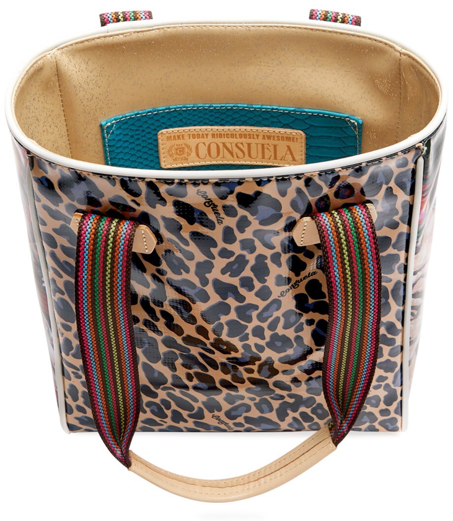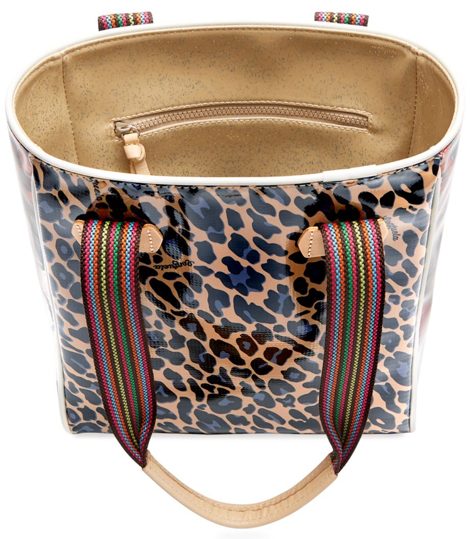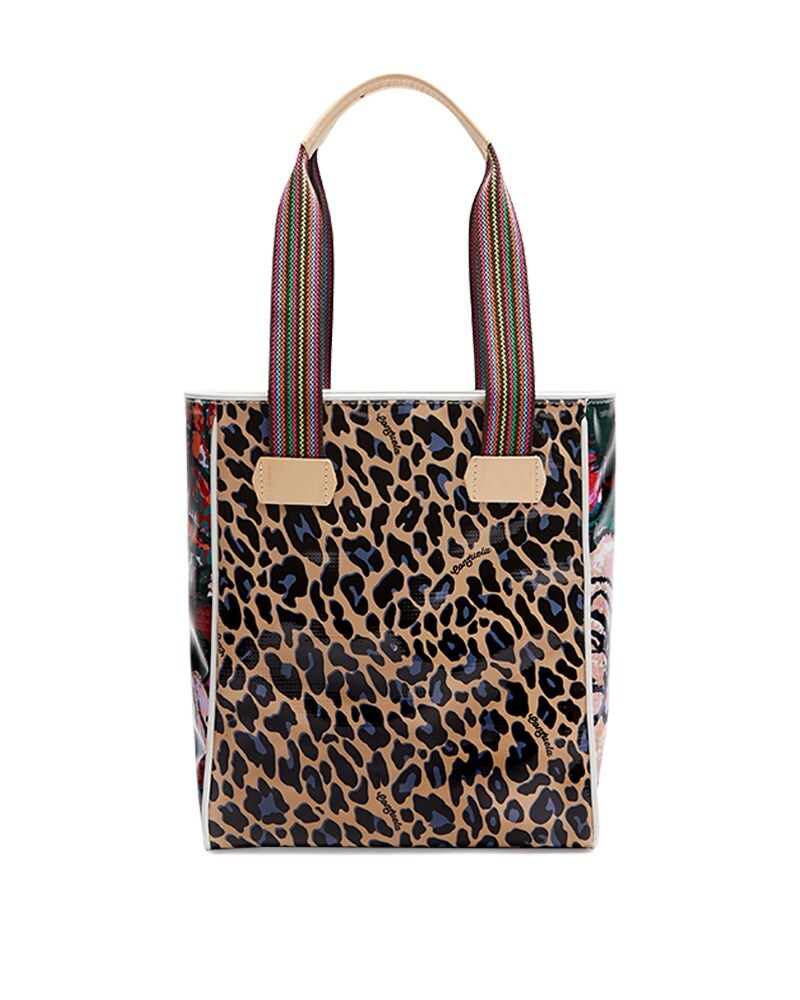 For the love of the Classic Tote, and the need for the essentials: the Chica Tote is a smaller version of our alltime favorite Classic Tote. Holding its shape and keeping things light, the Chica is ideal for the everyday haul. Glitter exterior with embroidered details Evadney quilted side panels Comfortable woven straps Interior open and zipper pocket Diego natural leather trim