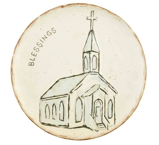 Send blessings to special people in your life with our Church Serving Platter. The speckled stoneware platter features a detailed imagine of a church. The platter features the word "Blessings" on it as well. This makes a great gift for newlyweds, new homeowners and other loved ones.