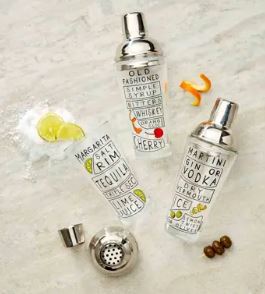 Drink happy thoughts with our Cocktail Shakers. The glass drink recipe cocktail shaker features a stainless lid and strainer. The shaker features detailed artwork with a classic cocktail recipe on it. The shaker features images for tequila, triple sec, lime juice and salt.