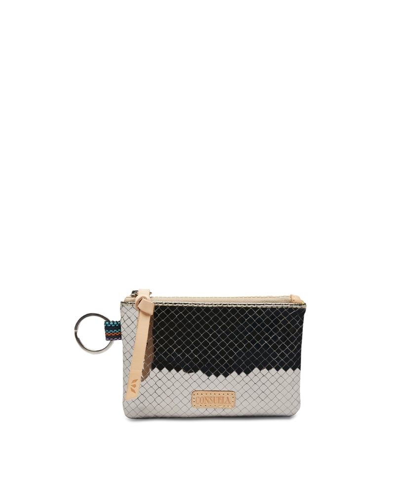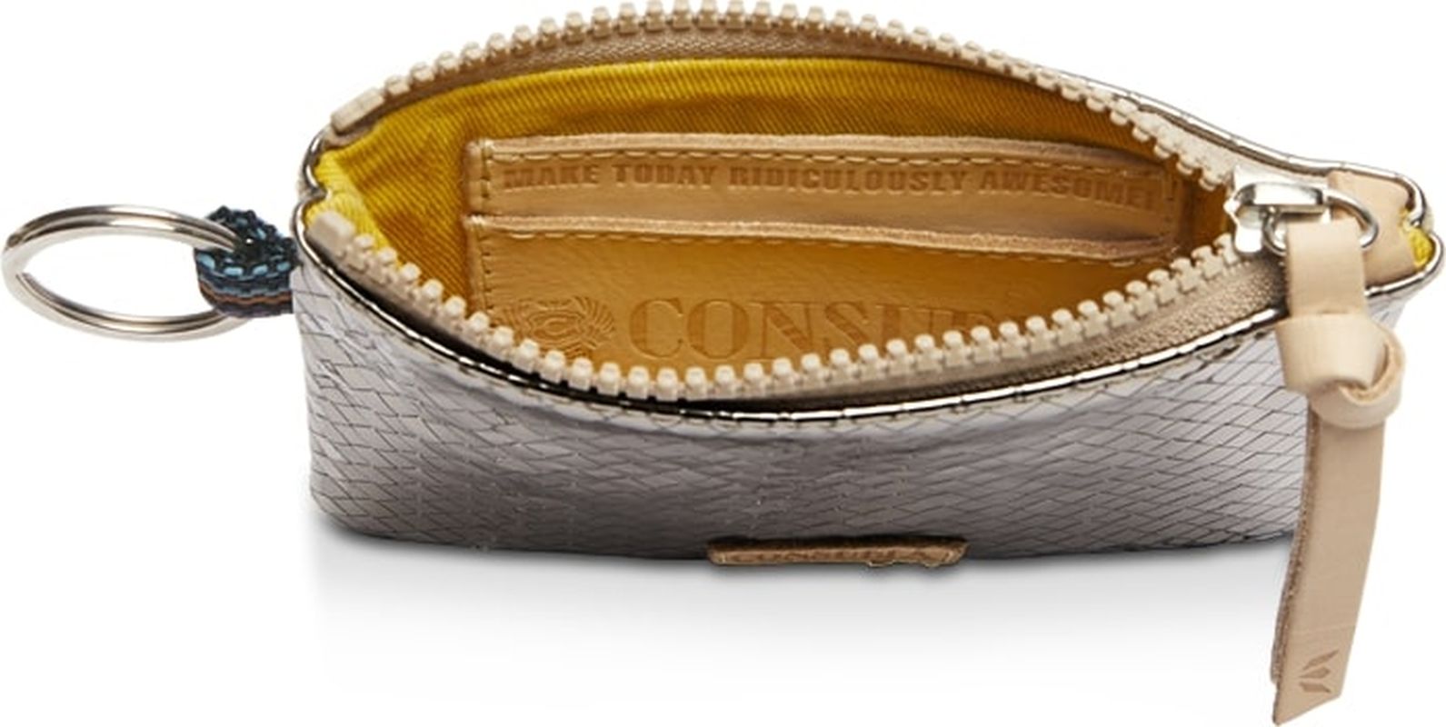 "The Pouch is an easy, all-in-one bag to keep your cards and cash organized and on hand. An attached metal keyring takes the Pouch from your bag to keys with ease. Gunmetal textured synthetic exterior. Open interior with credit card slots. Zipper closure with keyring."