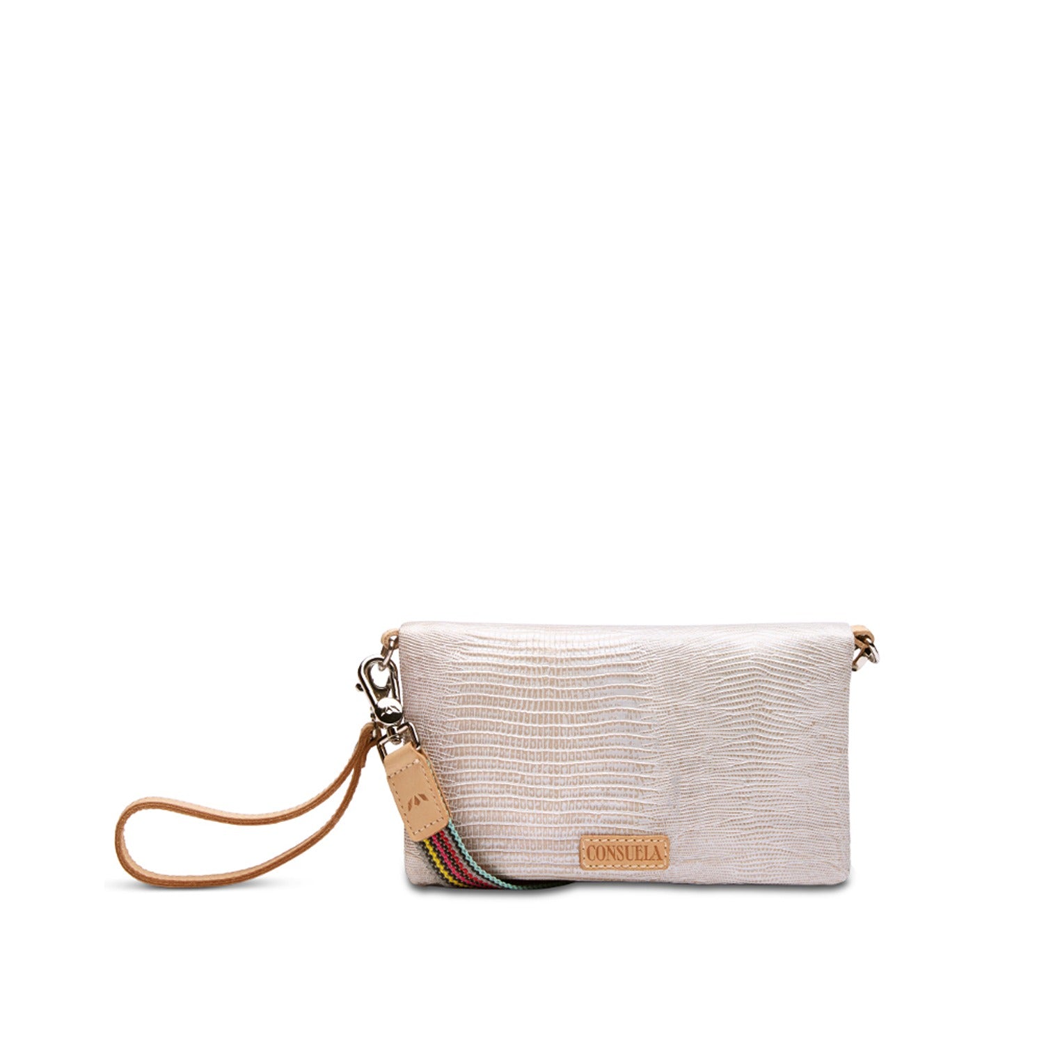 - Included detachable wristlet strap and adjustable woven crossbody strap