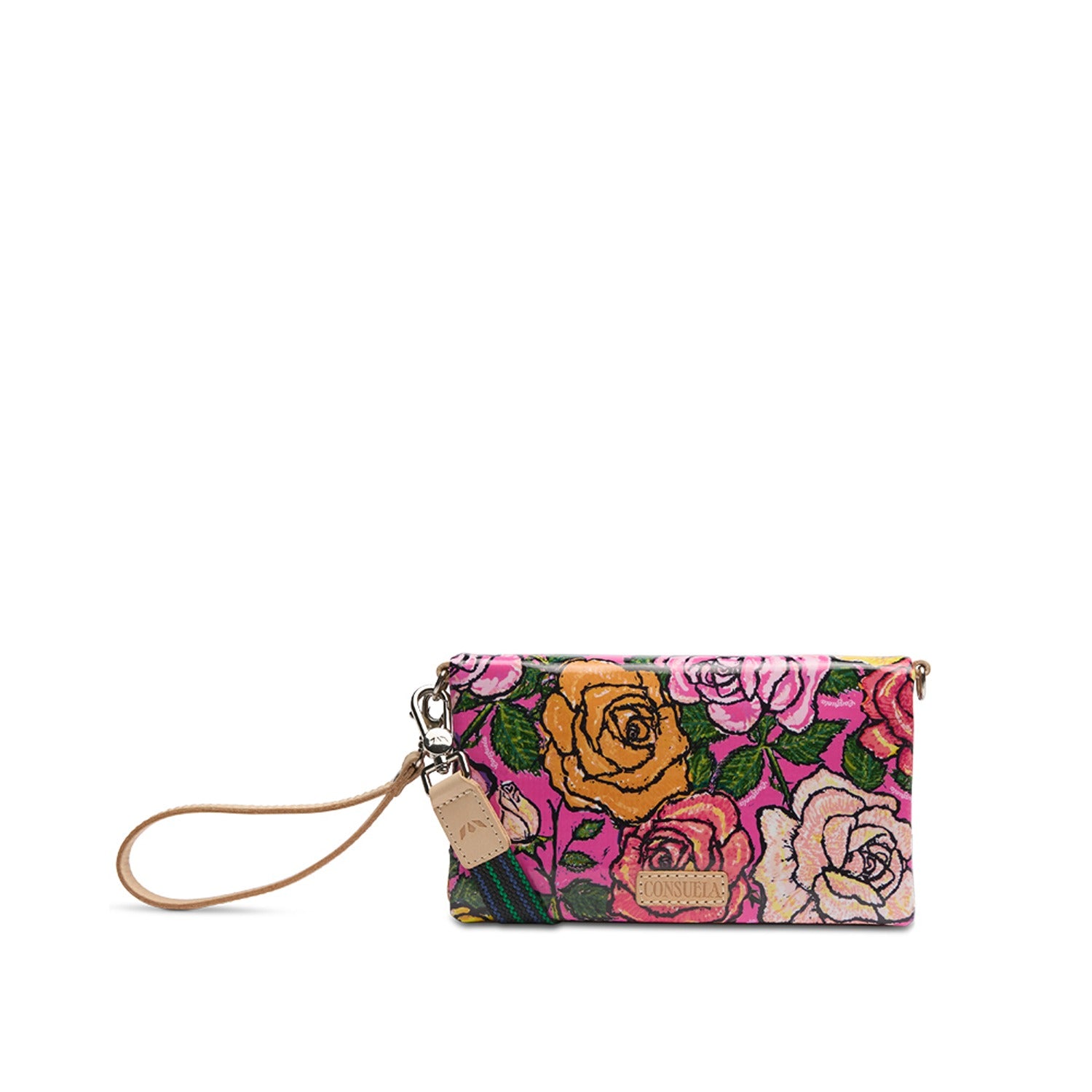 - Included detachable wristlet strap and adjustable woven crossbody strap