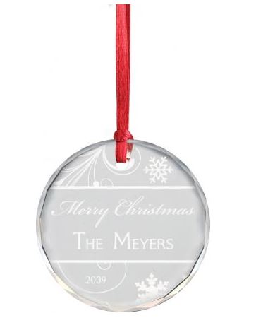 Simple and elegant, this crystal Christmas ornament is frosted with a laser to create the design. Threaded with a red ribbon, and ready to be hung from the tree.