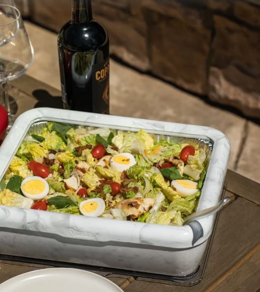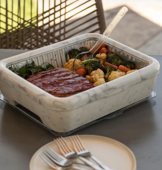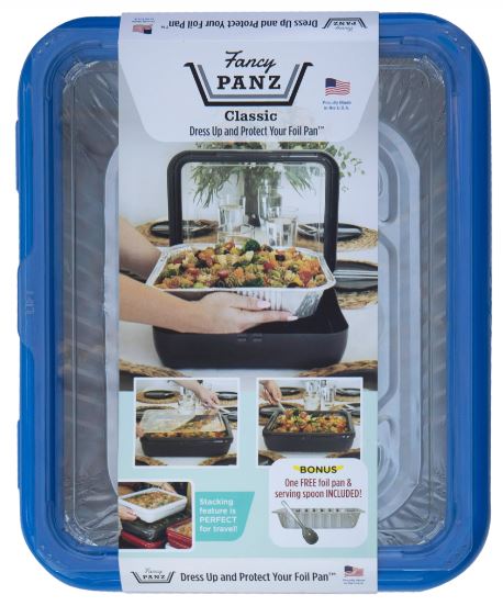 Fancy Panz are used to dress up, protect and serve from a foil pan. Our premium version comes complete with a reusable Hot/Cold gel pack that can be frozen, boiled or microwaved and nestles between the base of your Fancy Panz and the bottom of your foil pan. Perfect for tailgating, potlucks, outdoor dining, picnics, home and more!INCLUDED: One reusable Hot/Gel Pack, one “half size" foil pan and one reusable serving spoonEASY TO USE:- Open the attached frame, place your prepared Hot/Cold pack into the Fancy Panz, set your food filled foil pan directly on top of the gel pack & snap on the clear top. Use with hot or cold food, straight from the oven or fridge!TWO WAYS TO SERVE FROM FANCY PANZ: Remove the clear top and place under your Fancy Panz where it acts as a trivet OR leave the clear top on and lift from the tab to help maintain food temperature and keep pesky critters out! We designed the gel pack to keep food hot or cold from the bottom of your foil pan so that food temperature is maintained for longer even while serving!IDEAL FOR TRAVELING: Fancy Panz are stackable & sturdy! No more concerns over spilling the food during transportEASY CLEAN UP: Remove the foil pan and leave the leftovers for the remaining guests to enjoy. Forget the days of lost serve ware, you're taking your Fancy Panz with you!100% MADE IN USA