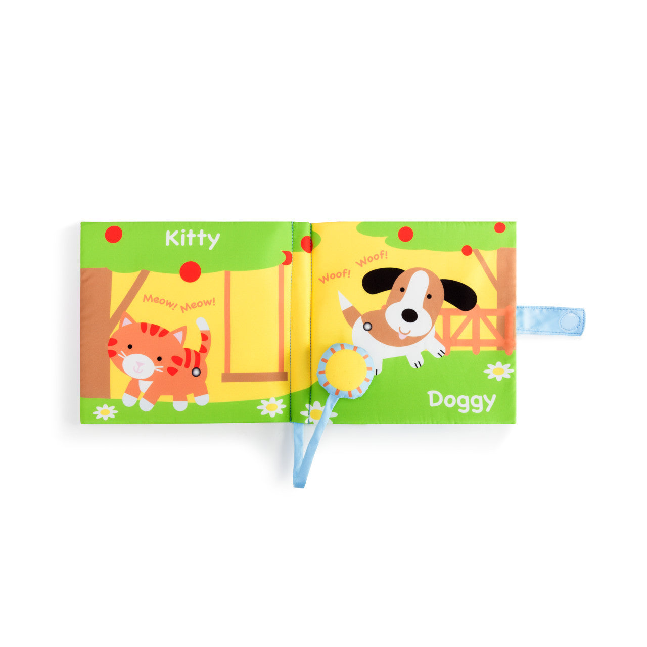 - Plays the following animal sounds: Bark, Bee, Butterfly, Cat, Duck, Frog, Ladybug, and Rabbit. Includes J-Hook for hanging. Opening on top of last page to replace the batteries. Requires 3 cell batteries. Ages 0+