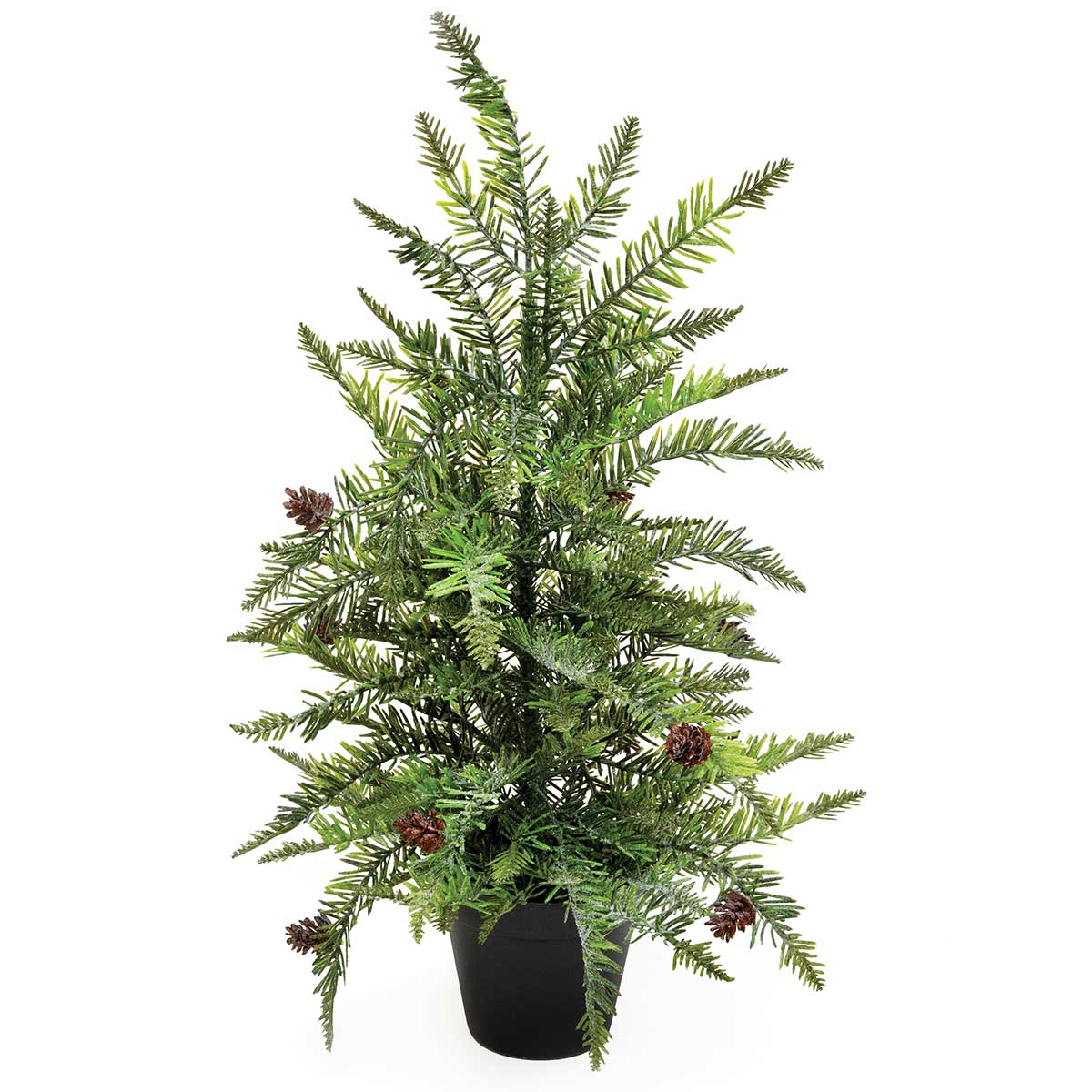 FROSTED PINE TREE IN BLACK POT WITH MICA AND FAUX PINECONES LARGE 14"X24"