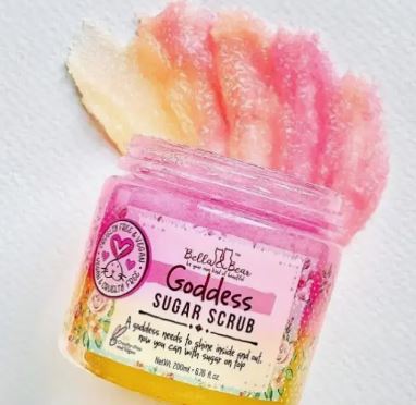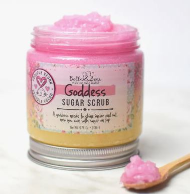 No sulfates, parabens - no harmful chemicals - cruelty-free - vegan-friendly exfoliating scrub. The goddess scrub has a light, fresh tropical fruity scent. Scrub away your scaly bits with the goddess scrub, sweet and dreamy with added skin softeners, our pink scrub will exfoliate your top and bottom.