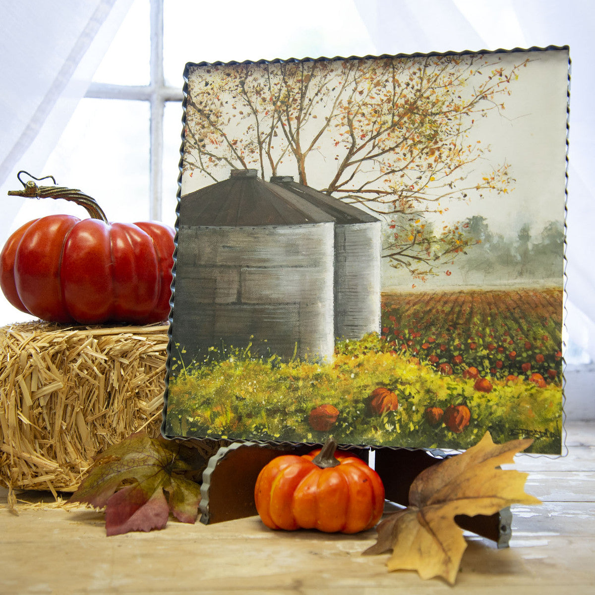 Silos stand tall and the air is cool and crisp. It’s early morning on the farm, as Roxanne captures the fog gently covering a field of pumpkins