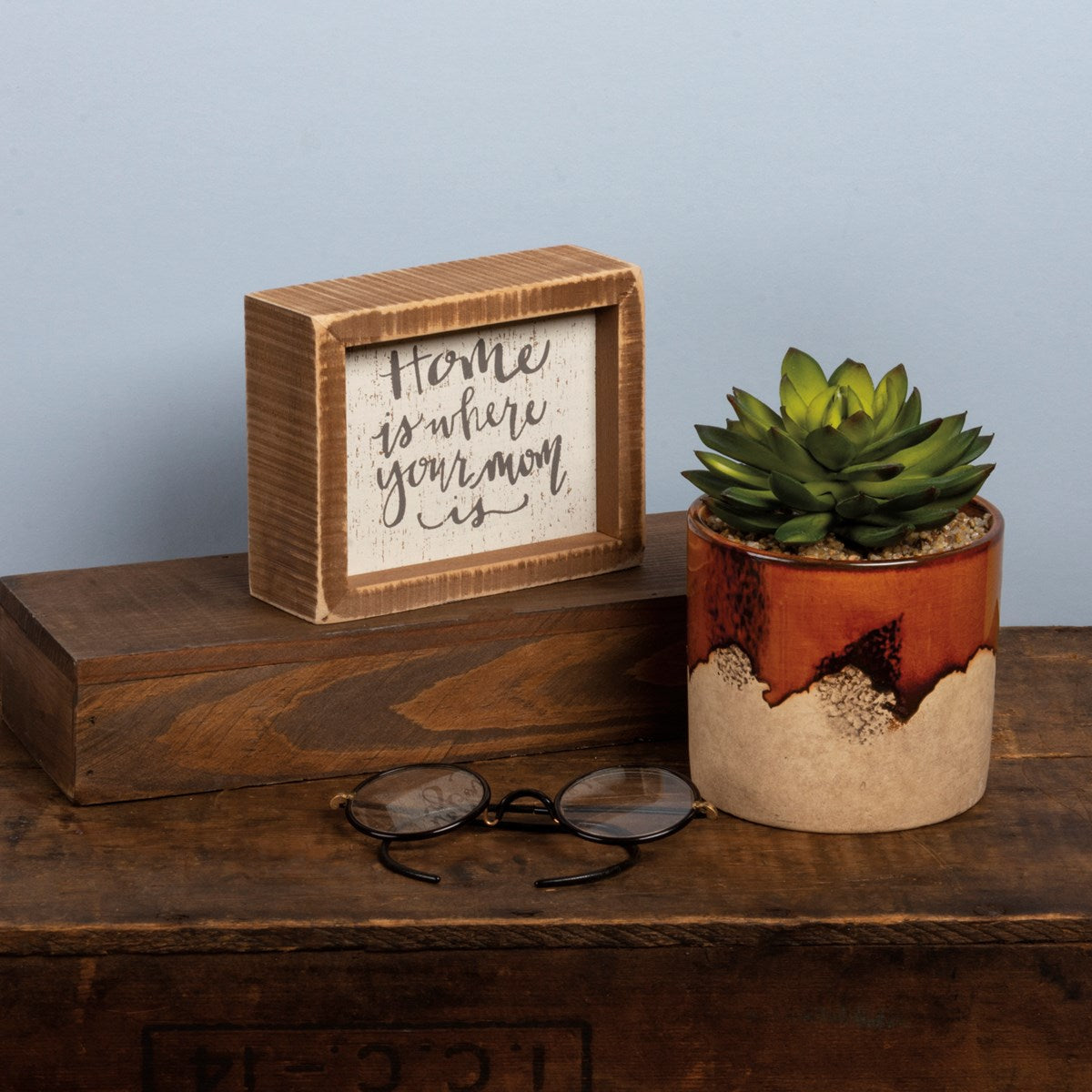 A wooden box sign lending an inset "Home Is Where Your Mom Is" hand lettered sentiment in a neutral palette with a natural wood trim. Easy to hang or can free-stand alone on a shelf or mantel. Complements well with coordinating design pieces for a thoughtful gift set.