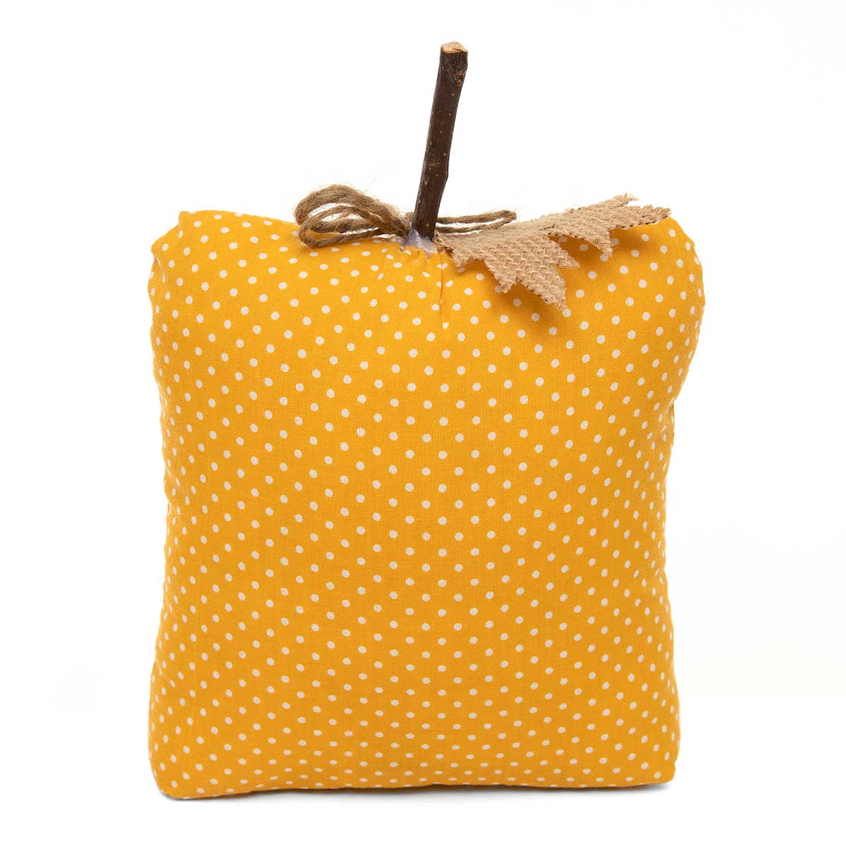 JACK-O-LANTERN PILLOW MUSTARD/WHITE PINDOT WITH STITCHED FACE, TWINE BOW, 2.5" REAL TWIG STEM, BURLAP LEAF AND WEIGHTED BASE 7"X3.5"X7"