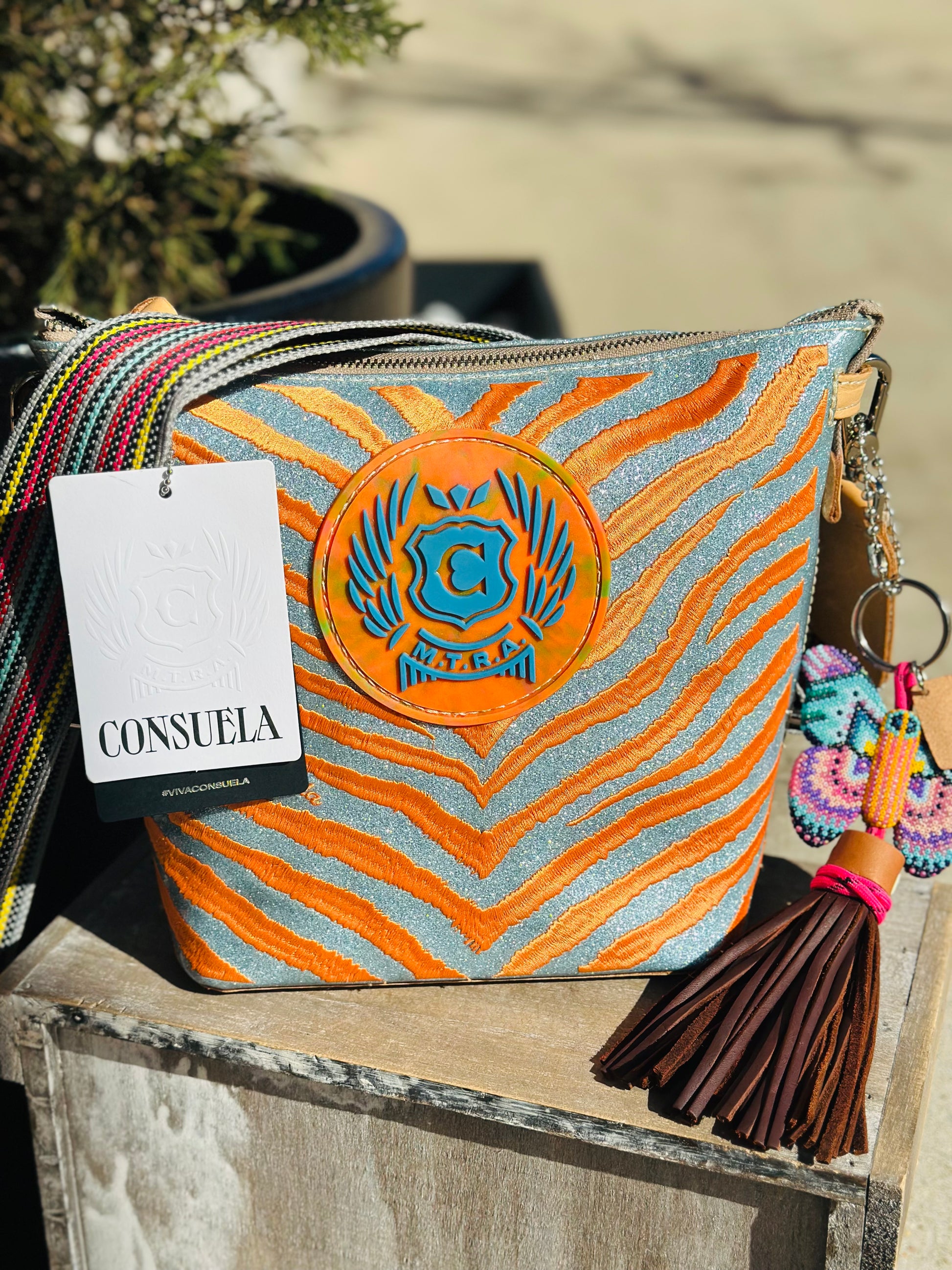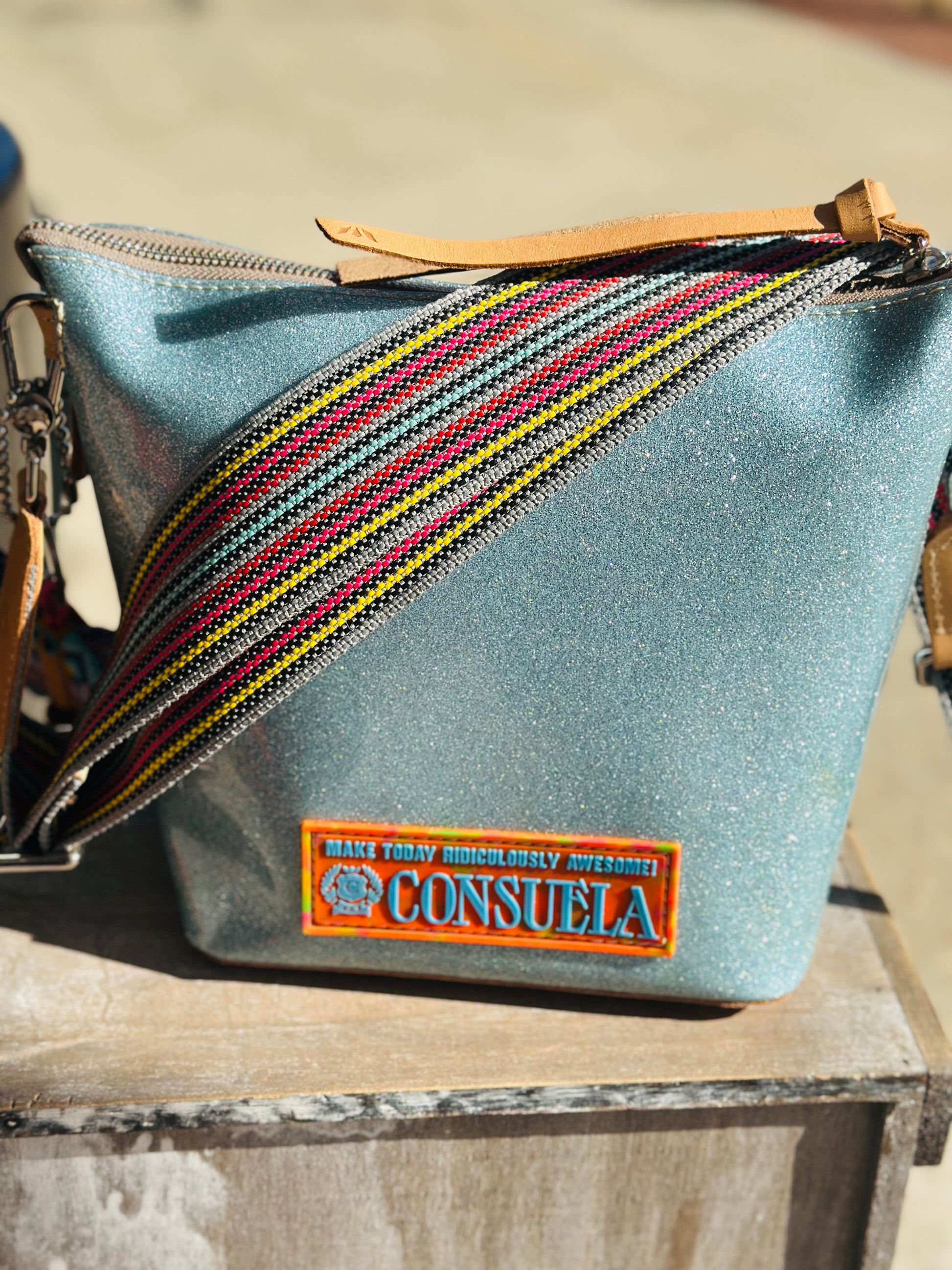 - Includes two straps: a leather shoulder strap (9 1/2" drop) and a woven crossbody strap (24" adjustable drop)