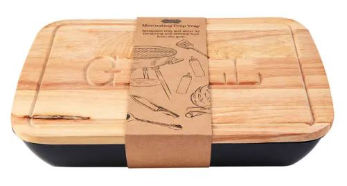 Your favorite grill master needs this Marinating Prep Tray. The melamine marinating tray comes with a wood lid. The lid doubles as a cutting board for slicing and serving food for the grill. The top of the lid features the sentiment "Grill". This makes a perfect gift set for dads!