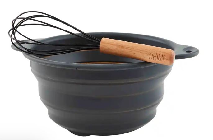 This Mixing Bowl and Whisk Set is cute yet functional. The two piece set comes with a collapsible silicone mixing bowl. The mixing bowl comes with a wood and silicone whisk that features the sentiment "Whisk". This mixing bowl collapses flat for storage when not in use.