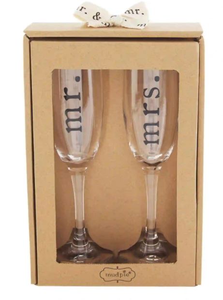 Toast to today, tomorrow, and always with our Mr. & Mrs. Champagne Flute Set. The two piece set comes with two glass champagne flutes. The champagne flutes read "Mr." and "Mrs.". The champagne glass set comes in a box, making it any for gifting to a future "Mr." and "Mrs.".