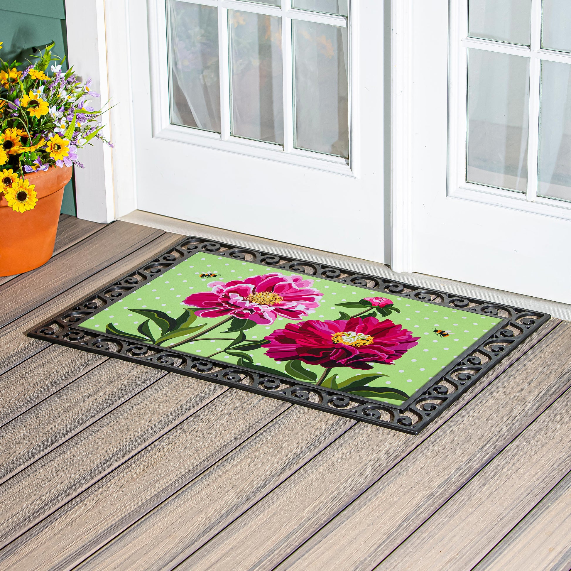 - Give guests a warm welcome with this Sassafras Switch Mat. It features a beautiful floral design. Crafted from heat-sublimated polyester with a rubber backing, this versatile mat is designed to fit perfectly within Evergreen's switch doormat bases. The mildew resistant mat is ideal for indoor or outdoor use and features a skid-resistant backing to help keep it in place. This welcoming mat will freshen up your stoop season after season while ensuring your home stays debris-free. For stains, simply spot clean with soap and warm water.