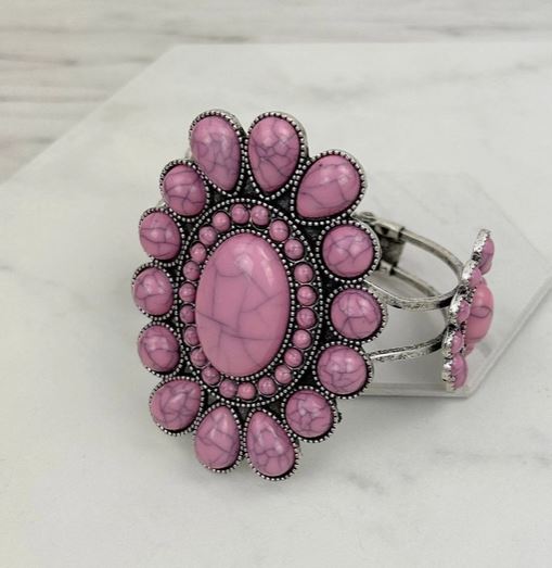 This BEAUTIFUL Silver Concho cuff bracelet that features a delicate light pink stones. This bracelet, part of our western and fashion jewelry line, is a testament to our over a decade-long commitment to offering high-quality, competitively priced pieces. Ideal for adding a touch of elegance and western charm to any outfit, this cuff bracelet is truly a unique accessory.