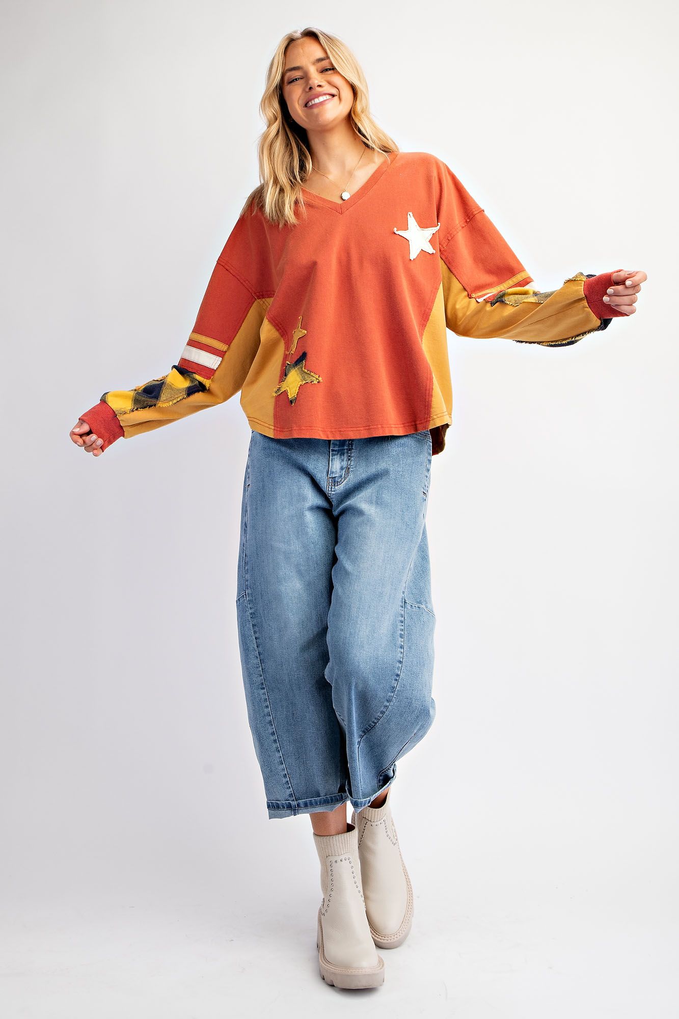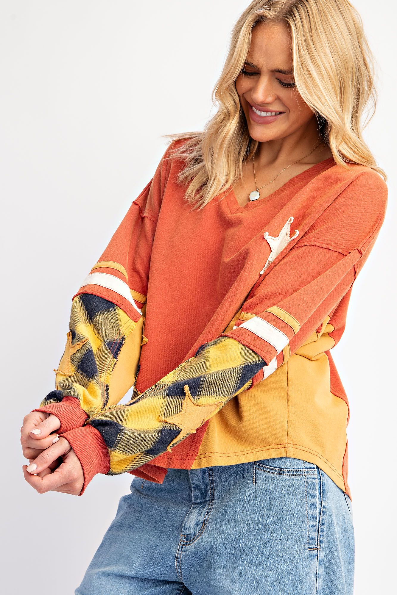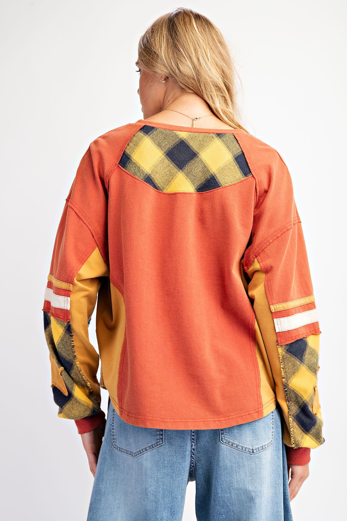 PLAID MIX COLOR BLOCK TERRY KNIT PULLOVER