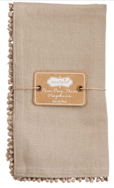 These pom khaki dinner napkins are a great basic for your dinner table. This set comes with four cotton dinner napkins. Each napkin has a delicate pom trim. The napkins are made from cotton. These napkins come in white, tan and gray and pair perfectly with our Spring serving dishes.