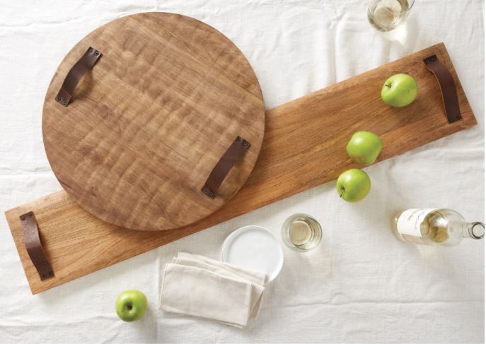 Generous sized mango round serving board features hand-carved irregular edge and genuine leather handles.