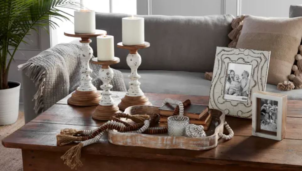 Add flowers to our scalloped wood tray for classy home decor. The scalloped mango wood tray features dimensional beaded side handles. The wood handles feature white washed wood beads. The tray can be used in a living room for decor, or at a dinner party to serve food or drinks. This is great for every season and the perfect addition to any ottoman, add your favorite coffee table books, candles and more!