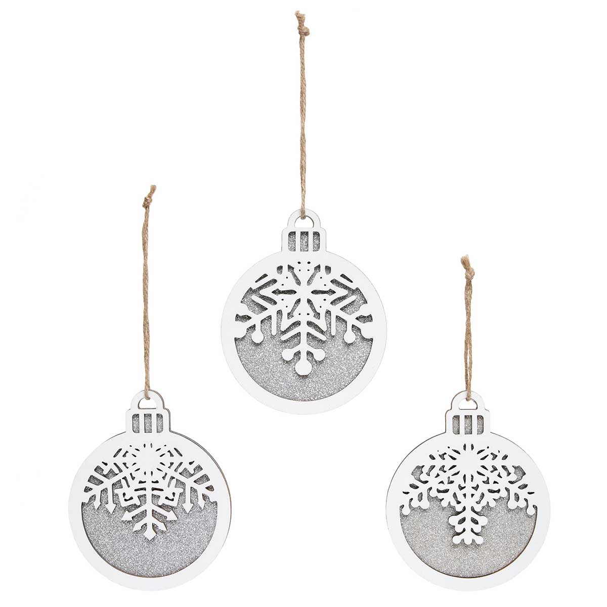 SNOWFLAKE ORNAMENT WHITE WITH SILVER GLITTER AND TWINE HANGER 3 ASSORTED 4"X5" MDF WOOD.