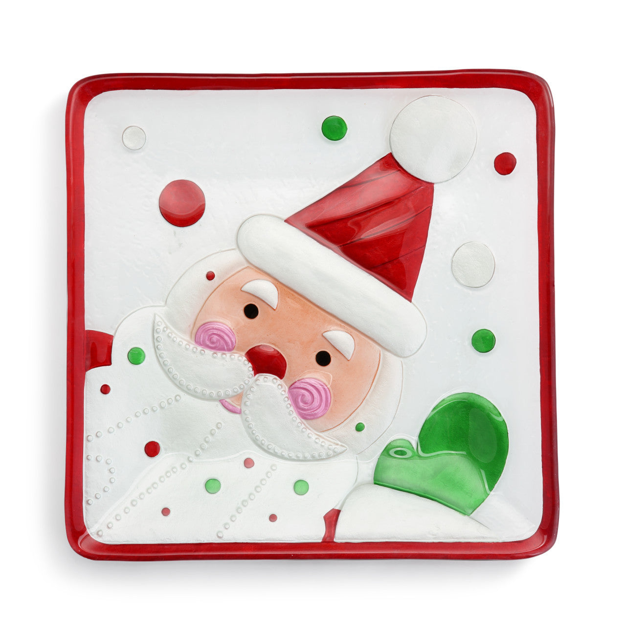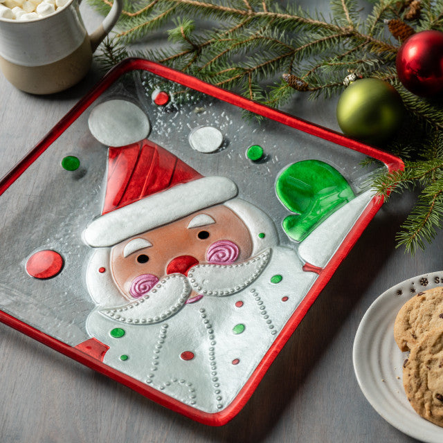 Using mixed media from watercolors to torn paper and clay, Lori Siebert finds new ways to create her signature artwork. The Glass Fusion™ Square Santa Platter showcases her artistry through glassware, combining vibrant colors and iridescent finishes.