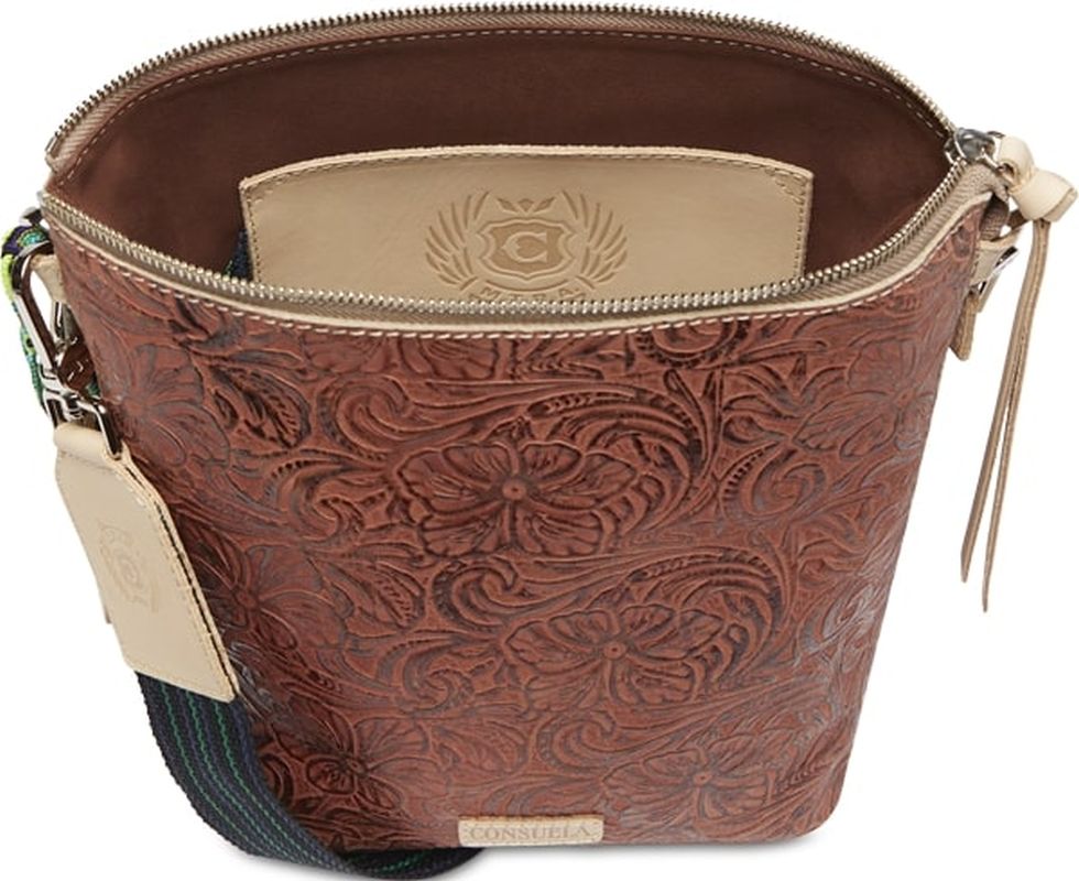 - Includes two straps: a leather shoulder strap (9 1/2" drop) and a woven crossbody strap (24" adjustable drop)