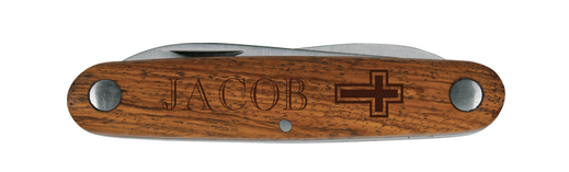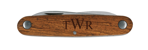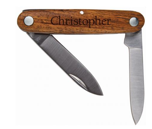 A pocket knife is a must-have tool, both on the job and off. Great for around the house, in the garage, and out in the wild. Personalize with a name, business, or sentiment. This pocket knife features a burl wood handle and 3.25" locking blade.