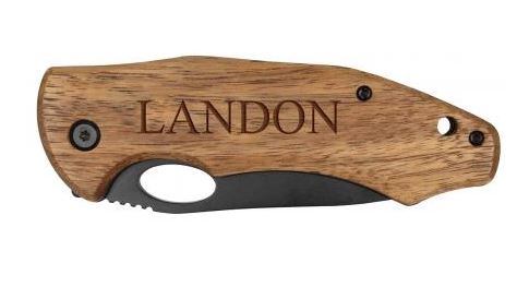A pocket knife is a must-have tool, both on the job and off. Great for around the house, in the garage, and out in the wild. Personalize with a name, business, or sentiment. Features a burl wood handle, pocket clip, and black 2.5" locking blade.