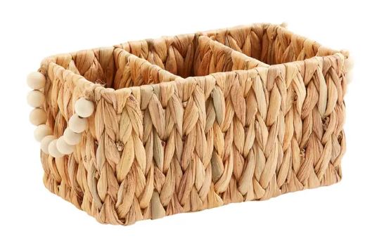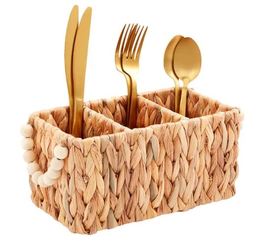 Create the perfect summer serving scene with our Woven Utensil Holder. The woven water hyacinth utensil holder features wood bead side handles. The utensil holder has three different sections, perfect for forks, spoons and knives. This utensil holder measures 4 1/2" x 9".